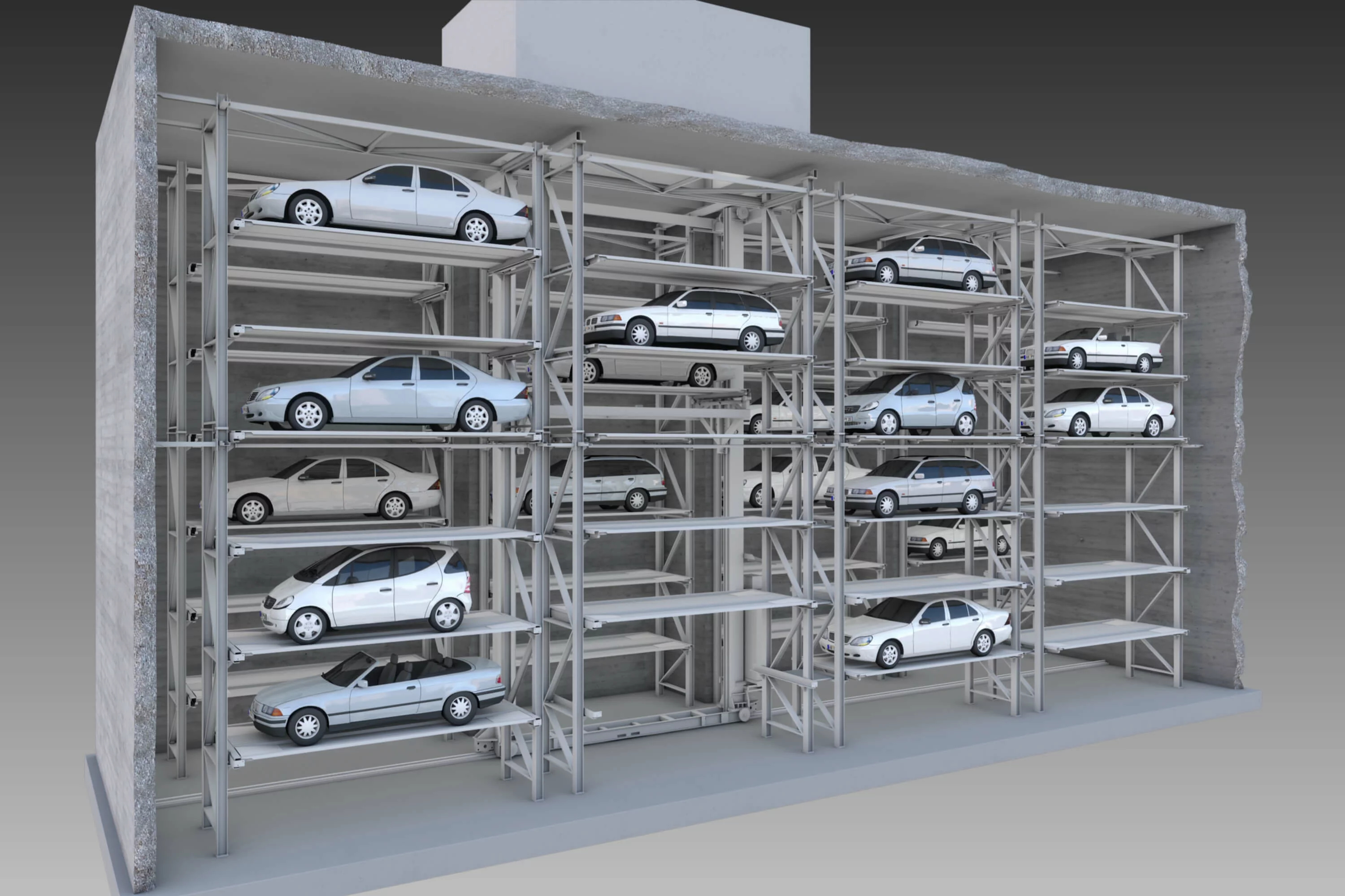The most popular automated parking system provides independent driver access, and multiple levels & rows for the highest possible parking density.